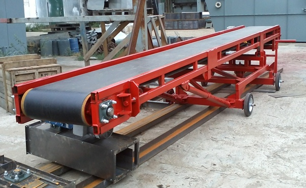 Передвижные ленточные транспортеры могут изготавливаться в прямом и наклонном исполнении. Рама конвейера имеет колесные опоры, обеспечивающие высокую мобильность оборудования. Барабан, приводящий в движение ленту, получает вращение от электродвигателя и редуктора.